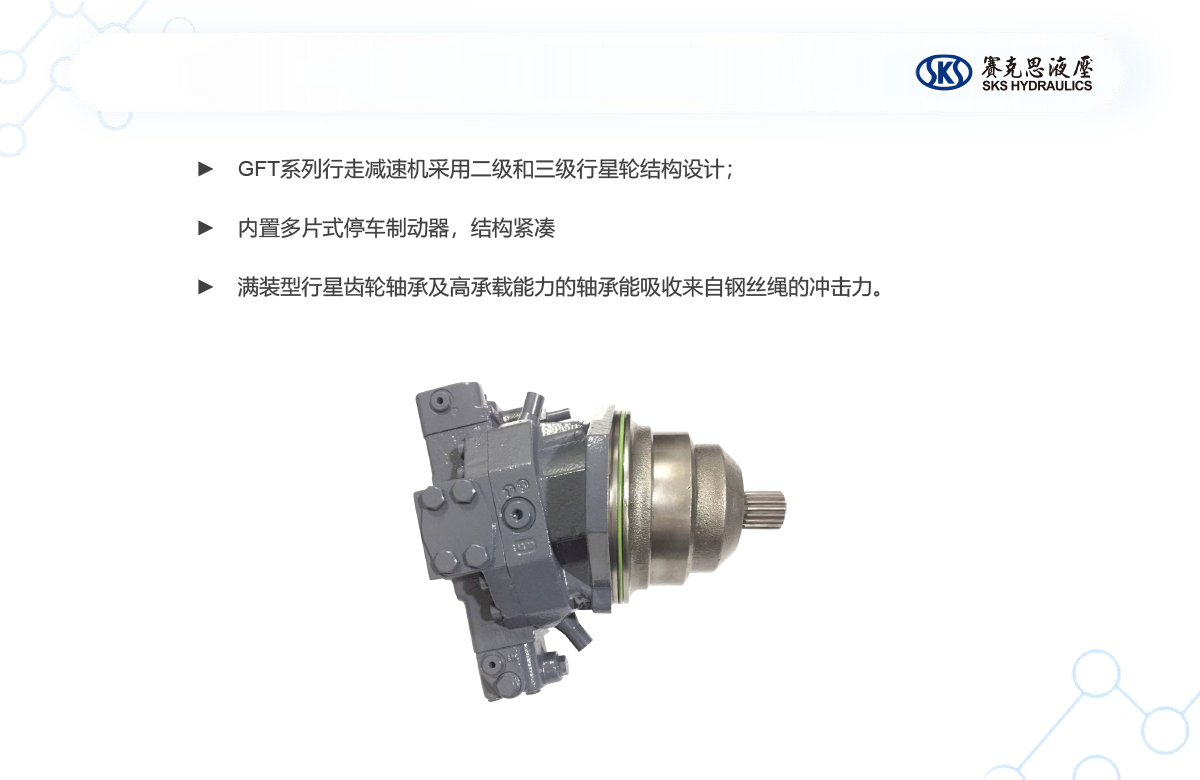 GFT系列行走減速機(jī)采用二級(jí)和三級(jí)行星輪結(jié)構(gòu)設(shè)計(jì); 內(nèi)置多片式停車制動(dòng)器,結(jié)構(gòu)緊湊 滿裝型行星齒輪軸承及高承載能力的軸承能吸收來自鋼絲繩的沖擊力。